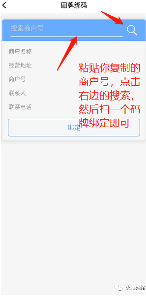 3、粘贴复制好的商户号,搜索展示全面后扫你的码牌进行绑定