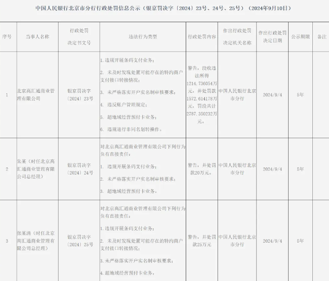 北京高汇通商业管理有限公司:巨额罚没,总计2787.35万元